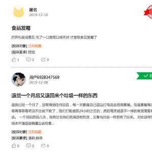 尽管今年三只松鼠实现了上市,但是产品安全问题依然突出,黑猫投诉平台上三只松鼠的投诉依然高达293件(截止12月17日),相较而言,其竞争对手的投诉约为其一半或者三分之一。《商学院》记者看到,三只松鼠主要投诉内容都是围绕食品安全,例如包装里有异物,产品发霉,事物中毒等问题,尤其是产品里有各种异物非常普遍。