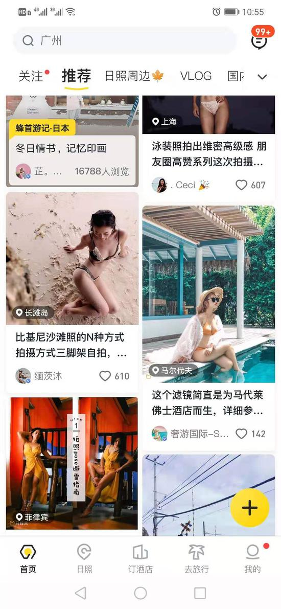 《商学院》记者打开马蜂窝APP看到,页面会默认停留在“推荐”一栏,这里的内容就是笔记,首页下方正中间的“发布”就是写笔记的入口。同时,记者注意到,“推荐”旁边还有一个“VLOG”栏目,这也是时下最受年轻人追捧的视频形式。