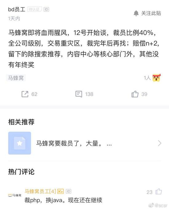12月12日,有网友在脉脉上爆料,马蜂窝将裁员40%,交易中心是“重灾区”,赔偿是N+2,除搜索推荐、内容中心等核心部门被留下外,其余均没有年终奖。