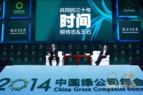 2014年是联想和万科创立三十周年。这年4月,中国绿公司年会邀请到他们,在央视主持人白岩松的主持下,展开一场巅峰对话,畅谈共同的三十年。