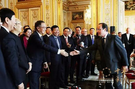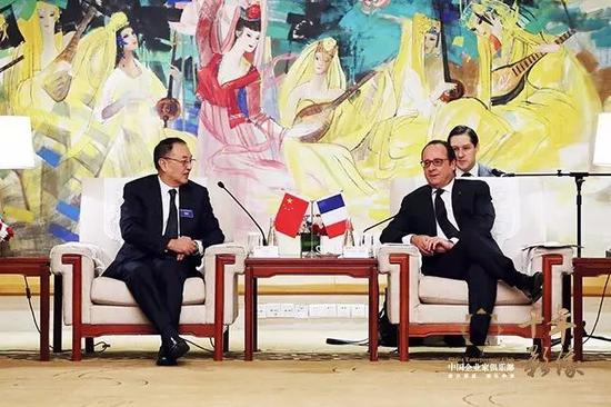 2015年11月,在“中国企业家俱乐部论坛——奥朗德总统早餐会”召开之前,与法国总统奥朗德亲切交流。