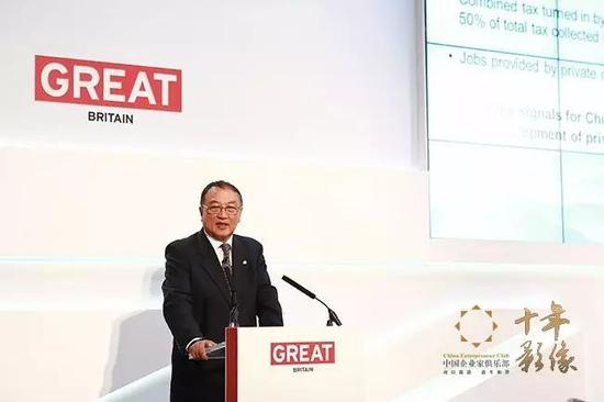 在英国国际访问期间的“中国商业日”上,柳传志向与会的300位英国政商学界嘉宾发表大会开幕致辞。