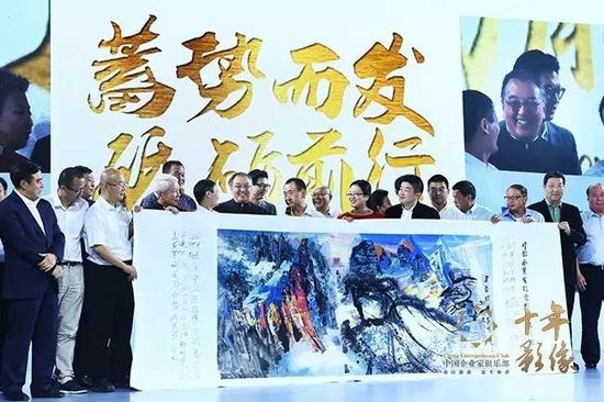 在联想控股上市主题活动上,俱乐部理事们共同上台,向柳传志赠送了礼物——国画大师石齐专门创作的《泰山松》。