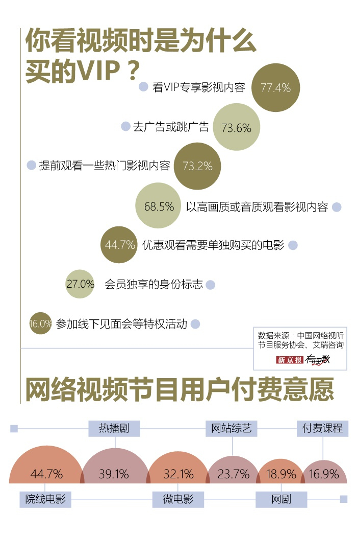 据艾瑞咨询《2018年中国网络视频行业经营状况研究报告》,看VIP专享影视内容、去广告或跳广告、提前观看一些热门影视内容,是大家花钱买视频网站会员最主要的几点原因。