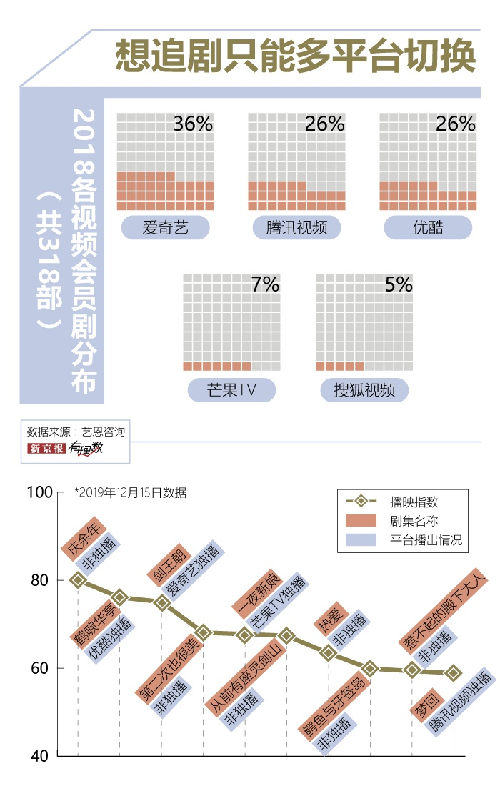 值得关注的是,这318部会员剧分散在各个平台,其中还有一部分是独播剧,只有一家视频网站有资源,像去年大热的《延禧攻略》《如懿传》《镇魂》,就分别是爱奇艺、腾讯视频和优酷的独播剧。