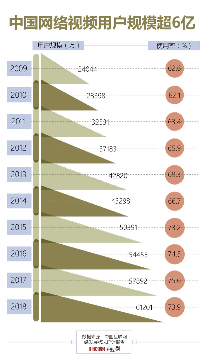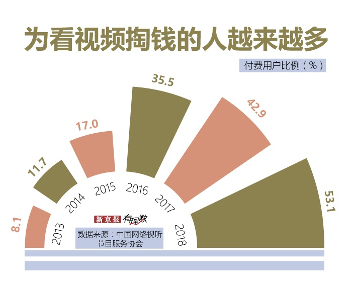 据中国网络视听节目服务协会的相关数据,2018年网络视频付费用户比例超过53%,这一数字是2013年的6.6倍。