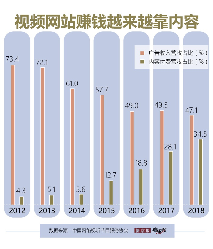 截至2018年底,内容付费收入已占到视频网站总收入的34.5%。