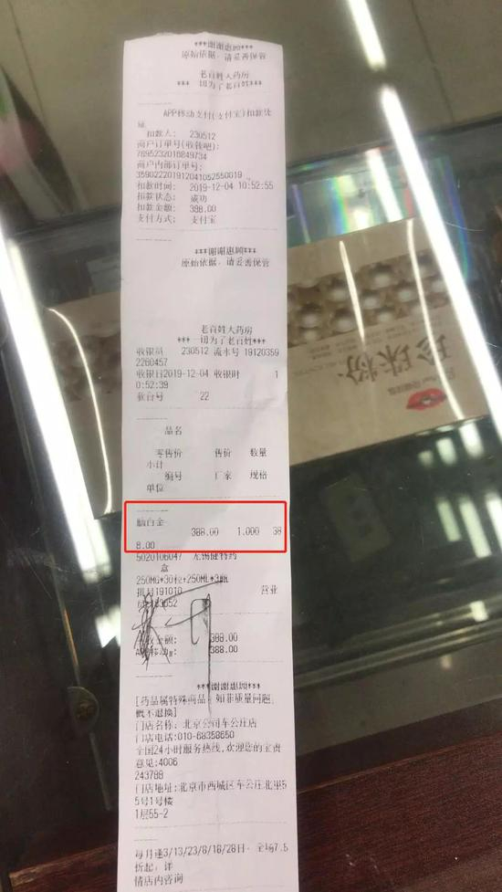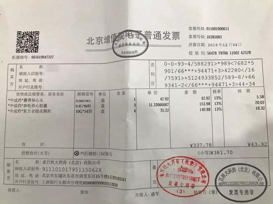 2019年12月4日,商业观察来到位于北京市的老百姓大药房车公庄店,在药店购买了388元的保健品后,询问店员是否可以开成药品发票,“以便”报销。该药店店员表示可以,并在当日下午即将药品电子发票发到电子邮箱中。