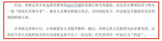 2012年,一篇名为《老百姓大药房IPO隐忧 医保刷卡混乱盈利能力差》的报道中就提到一个细节:“导报记者并未选择其推荐的汤臣倍健胶原蛋白粉等保健品,而是表示要刷医保卡购买一袋‘满堂红多维冬枣’。服务人员稍有犹豫后表示,可以刷医保卡,但前提是不能提供具有明细的购物小票。导报记者又以报销为由索要发票,该药店开票人员按照相关价位为导报记者开出了一张发票,但发票项目一栏标注为‘药品’。”