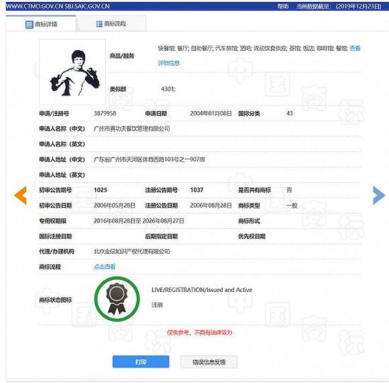 查阅中国商标网可以留意到,真功夫近年来已获得了不少“功夫龙”形象的注册商标,其中部分商标的注册时间已超过了5年,对于这些商标,游云庭表示,李小龙公司可能只能通过诉讼获得一定的赔偿,但很难制止真功夫继续使用。
