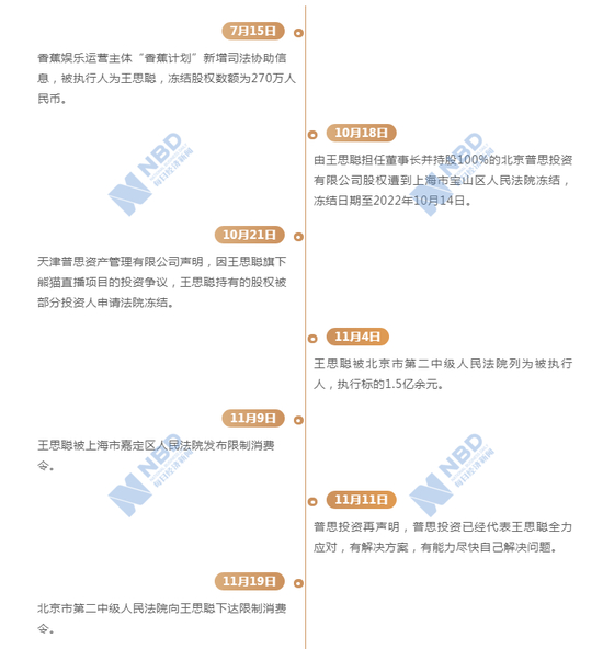 今年10月以来,普思资本及王思聪频频因熊猫互娱的“死亡后遗症”被送上热搜。10月18日,普思资本被曝股权遭上海市宝山区人民法院冻结;之后的11月4日,王思聪本人又被北京市第二中级人民法院列为被执行人,执行标的约1.5亿;11月9日,王思聪被上海市嘉定区人民法院发布限制消费令;11月19日,王思聪被北京市第二中级人民法院再次发布限制消费令;11月22日,北京市第二中级人民法院通报查封王思聪名下的房产、车辆、银行存款等财产;12月10日,因股权纠纷,王思聪名下2200万元资产被上海宝山法院冻结。