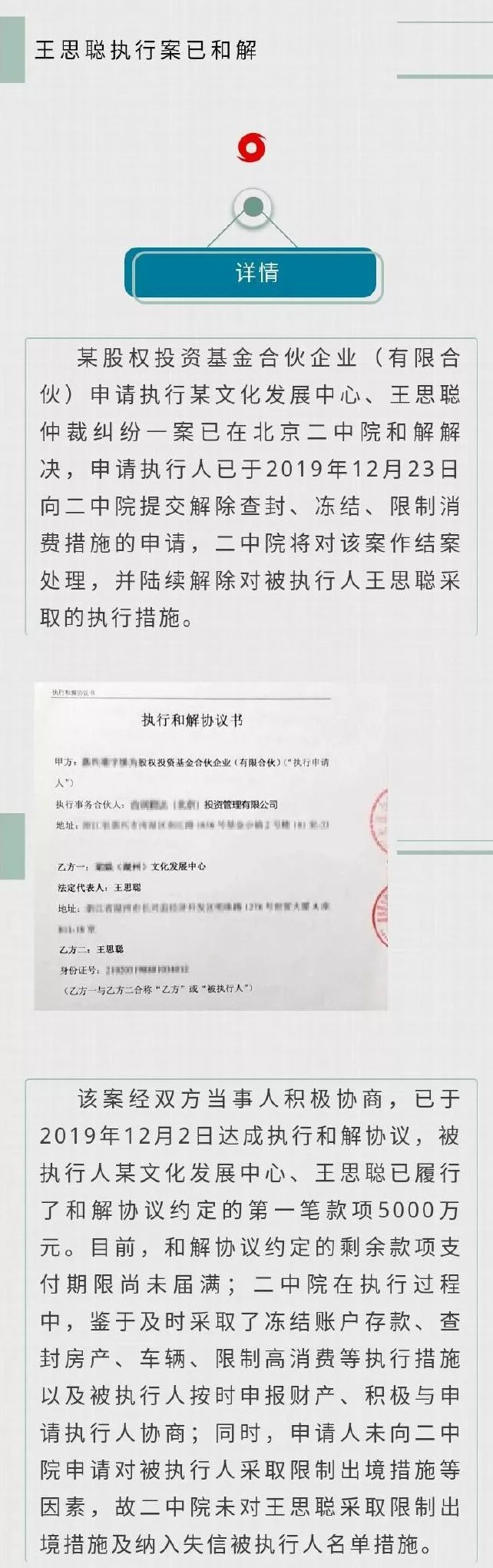 12月24日上午,北京二中院官方微博称,王思聪仲裁纠纷一案已和解解决,北京二中院将陆续解除对被执行人王思聪采取的执行措施。