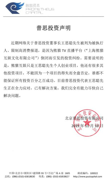 不过,声明之中带着王思聪的倔强:“几年来,普思投资了几十个项目,大部分项目是成功的,不能因为熊猫互娱单个项目的创业失败说成是普思资本及实控人整个创业的失败。普思投资及实控人将诚实守信,继续创业。”