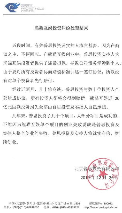 12月26日,王思聪旗下普思投资发布《熊猫互娱投资纠纷处理结果》称,经过近两月几十轮商谈,普思投资与数十位投资人全部达成协议,所有投资人都得到了赔偿,熊猫互娱近20亿元巨额投资损失全部由普思投资及实控人承担。