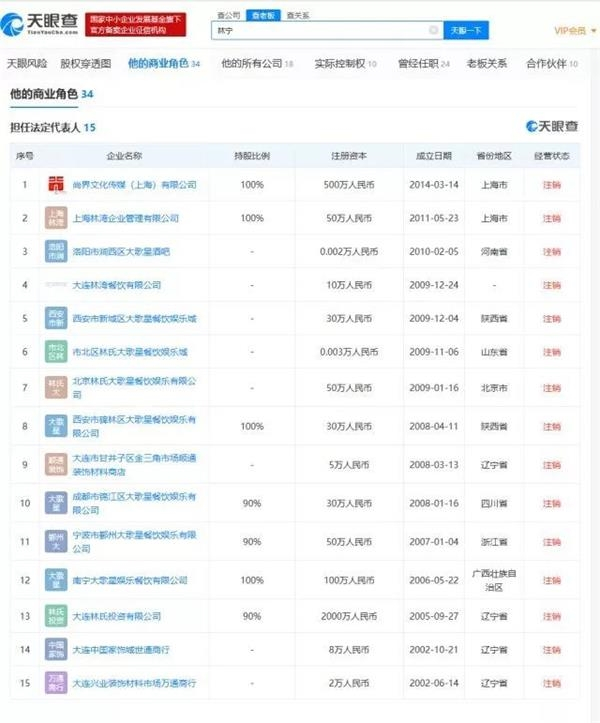 天眼查数据显示,目前林宁仍担任15家企业的法人,9家企业的股东和10家企业的高管。不过担任法人的15家企业经营状态全部为注销,涉及行业有餐饮业、零售业商务服务业和娱乐业等。