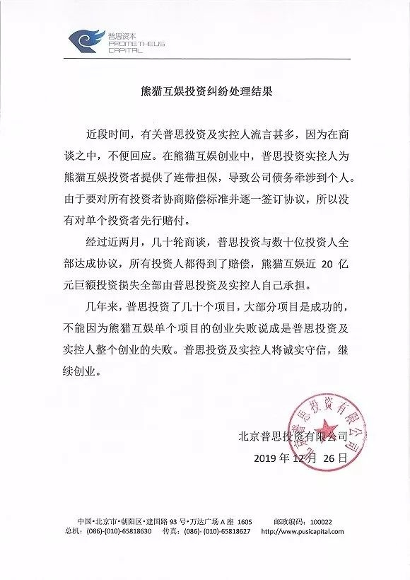 12月26日,普思资本发布《熊猫互娱投资纠纷处理结果》: