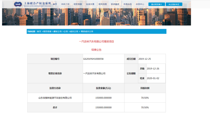12月26日,《每日经济新闻》记者从上海联合产权交易所获悉,一汽吉林汽车有限公司增资项目结果落地,低速电动车企业山东宝雅新能源汽车股份有限公司(以下简称宝雅新能源)以15亿元获得一汽吉林70.5%股权。