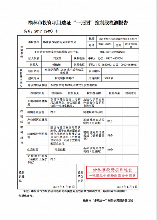 2017年7月,榆林市发改委发布《关于华能陕西靖边电力有限公司东坑伊当湾100兆瓦光伏电站项目备案的通知》(榆政发改发[2017]490号),同意该项目备案。