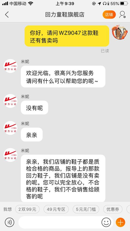 午茶君在“回力童鞋旗舰店”上询问客服是否有WZ-9047童鞋售卖,其回应称“不合格的鞋子,我们不会销售给顾客。”