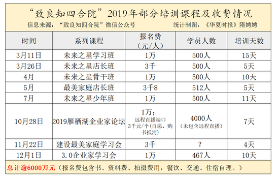 但并不是每场培训都是公益性质的。本报记者通过其官方微信公众号了解到,“致良知四合院”系列课程报名费在3000元/人至10000元/人(食宿交通自理)。记者随机选取了该组织2019年的8场培训活动,通过其公布的报名费及人数计算出,仅现场报名费就超过6000万元,而事实上“致良知四合院”2019年总活动场数为41场。