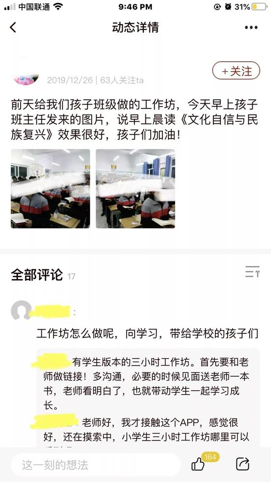 远东控股某员工也向本报记者描述,该公司目前的培训活动为晨读“小红书”、在“四合院”APP上完成心得、轮流组织员工利用下班时间参加三小时工作坊。“就是看白立新和张立平的视频讲话,然后反省自己,再上台分享。”他说。