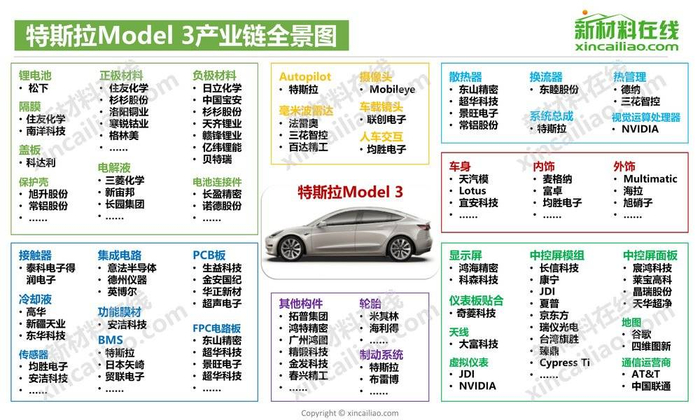 (不完全统计Model 3的供应链体系,图来自新材料在线)