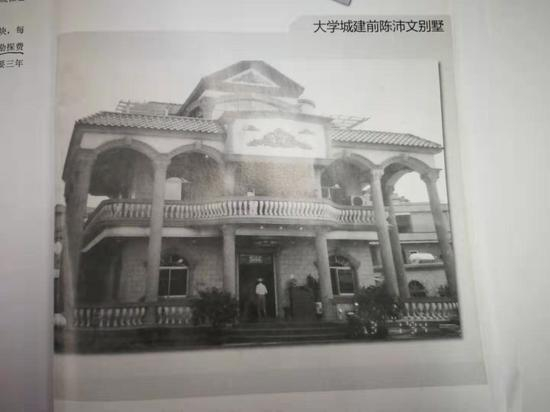 早在广州大学城开始建设以前,最晚在2002年,陈沛文就已经在这座岛上建起一栋三层高五开间的大型别墅。随着大学城的动迁建设,这栋别墅被拆除,其价值已经无法考究。 不过从个人传记书中刊载的照片来看,陈沛文别墅装饰的豪华程度,即使放到十几二十年后的今天,也不逊色于市面上的同类产品。在其发迹的广州大学城北亭村,有两名老者向记者证实了这栋别墅曾经的存在,其旧址位于如今的岭南印象园码头附近。