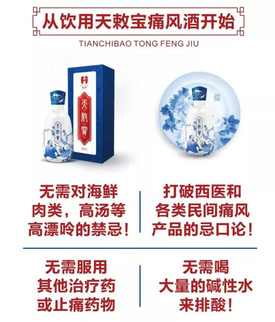 福唤·天敕宝痛风酒广告 疗效神奇的福唤·天敕宝痛风酒,究竟从何而来?据天敕宝酒业公司官网介绍,该产品由身患痛风的吴天荣寻访得来,系“10种中草药结合传统古法研制”而成,经其“亲身试药有效”。目前该网站显示正在建设中,点击后已经无法打开。 就上述疑点,记者近日致电中亿健康及天敕宝酒业两家公司,但电话均未接通。