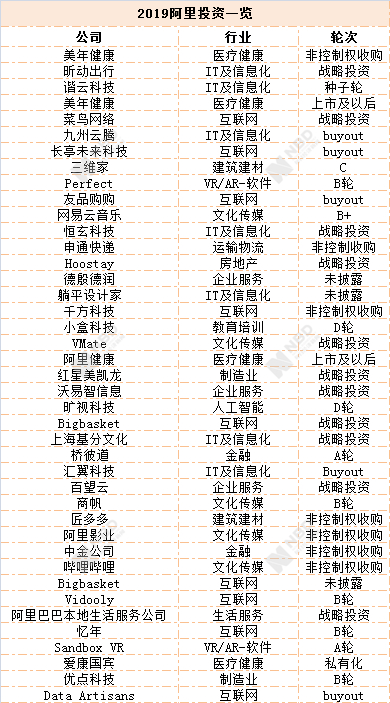 (注:以下统计均不包含相关公司的投资,如蚂蚁金服的投资不计入阿里巴巴)