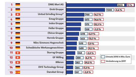 图为全球15大机床品牌2017年与2018年的营业额情况对比(单位:百万欧元)数据来源:gir(全球信息研究)