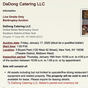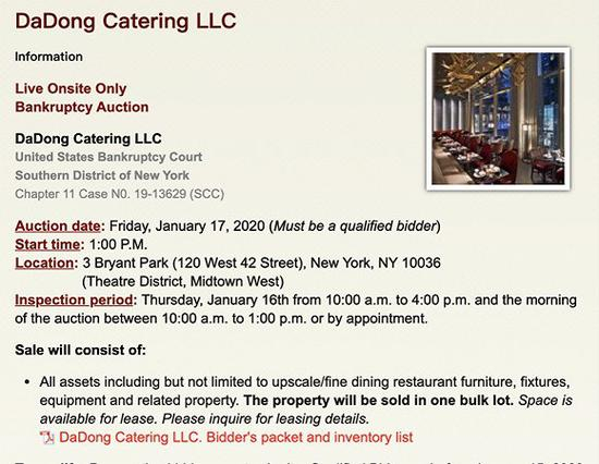 近日,大董烤鸭的美国公司DaDong Catering LLC(下称“纽约大董)悄然出现在了美国拍卖公司Moecker Auctions,Inc.的项目列表中。