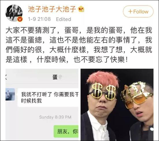 一时间,作为池子昔日的最佳搭档、笑果文化旗下艺人兼股东李诞,也成了网友热议的对象。对此,池子在微博发文并晒出与李诞的合影,疑似回应与李诞不和的传闻。