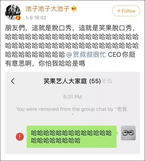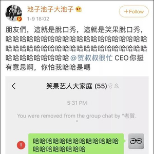 1月9日下午,在脱口秀演员池子宣布退出《吐槽大会》2天后,他晒出了被《吐槽大会》出品方上海笑果文化传媒有限公司(下文简称为笑果文化)CEO贺晓曦移出群聊的截图,并配文“朋友们,这就是脱口秀,这就是笑果脱口秀……CEO你挺有意思啊,你怕我哈哈是吗”。