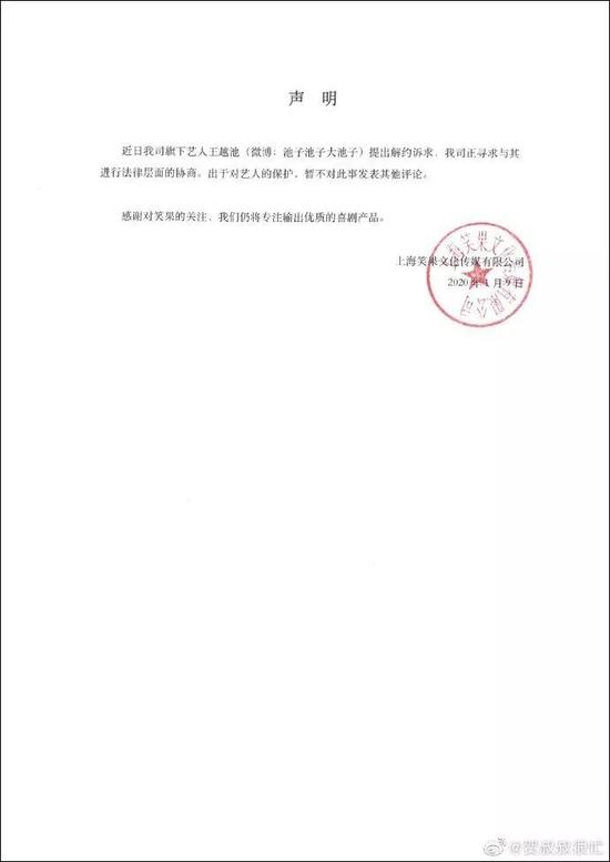 而笑果文化联合创始人、CEO贺晓曦@贺叔叔很忙 也在当晚22时53分作出回应,他发表笑果文化官方声明称:该公司旗下艺人王越池(池子)提出解约诉求,该公司正寻求与其进行法律层面的协商,出于对艺人的保护,暂不对此事发表其他评论。该公司仍将专注输出优质的喜剧产品。