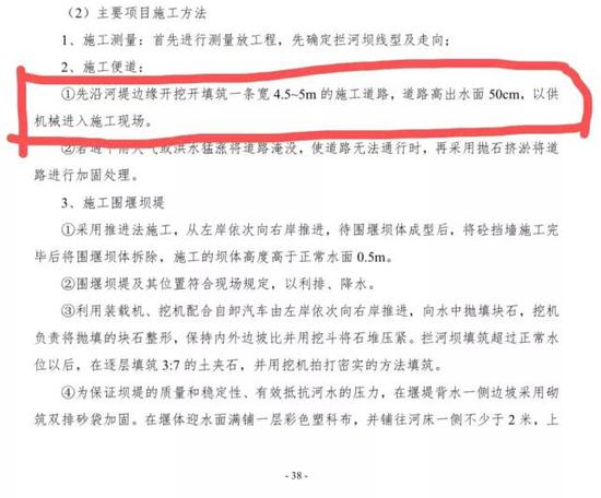 根据该项目的环评报告表,第38页里明确写道:“420米的施工便道,先沿河堤边缘开挖填筑一条宽4.5到5米的施工道路,道路高出水面50cm,以供机械进入施工现场”。