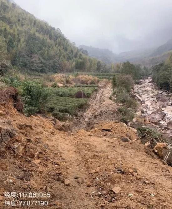 2019年11月左右,本景区工作人员发现此处树木被砍伐。而原本土地也被挖掘机清整过地面。而附近十几米处,就是下图中铺设引水管线工程所在地,对比经纬度可知,两处相距很近。