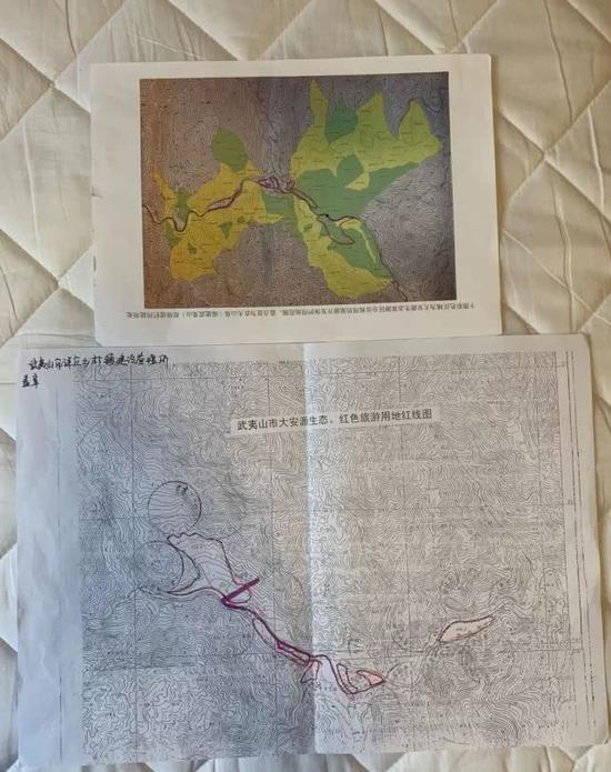 上图为大安源景区的旅游开发租用地的林班图,亦是政府早已确定下的景区开发范围。下图为用景区配套建设用地红线图。目前,农夫山泉的施工和埋管,侵占了本景区的旅游开发租用地和建设用地。