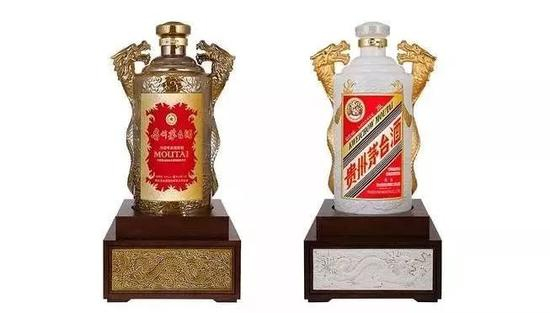 这一对,学名“双龙汇”茅台,是为了庆祝中国酒业协会名酒收藏委员会成立一周年、纪念茅台1915年荣获巴拿马万国博览会金奖推出的(金奖是他们宣传的,实际上拿的是银奖),限量上市,二瓶一组,每瓶50斤(25L),合计100斤。