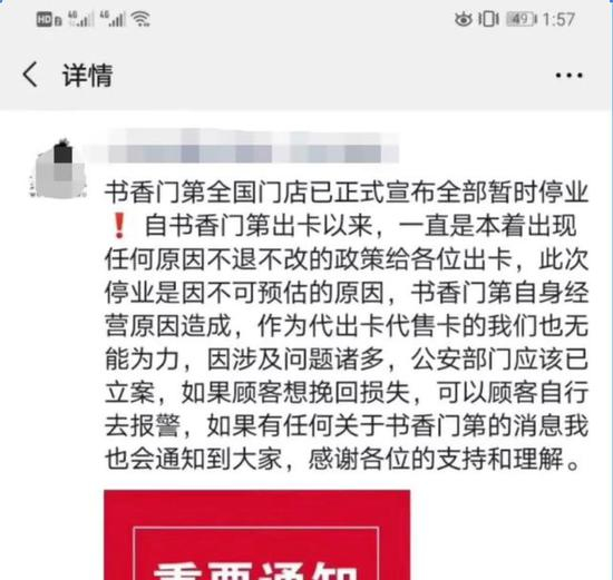 疑似“书香门第代售卡”一方在微信朋友圈发出消息称,“书香门第全国门第已正式宣布全部暂时停业!