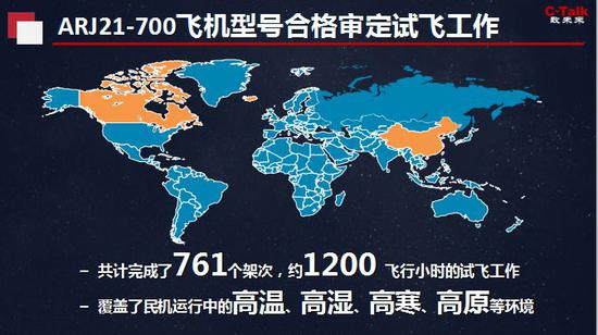 对于我们来说,最主要的工作还是ARJ21-700飞机型号合格审定试飞工作。在局方介入之后,一共执行了761个架次的飞行,约1200飞行时长的试飞工作。完成了涵盖高温、高湿、高寒、高原等相关的环境要求,以及大量的高风险的试验,比如说大侧风、自然结冰等等。