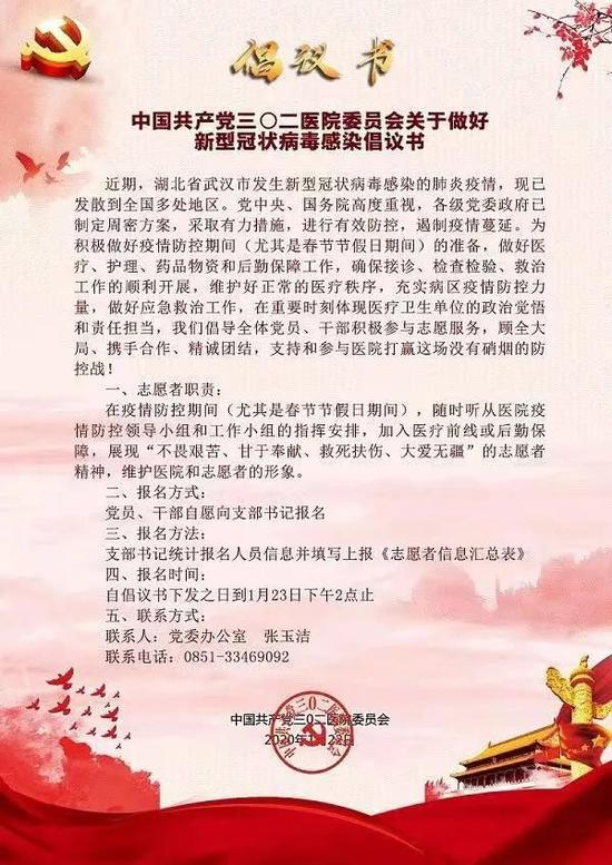 面对肺炎疫情,1月22日,作为三级甲等综合医院,通用技术集团通用医疗所属贵州安顺三〇二医院党委、工会、团委分别发出关于做好新型冠状病毒感染应对倡议书,倡导全体党员、干部、职工以及青年团员积极参与志愿服务,做好医疗、护理、药品物资和后勤保障工作,确保接诊、检查检验、救治工作的顺利开展,维护好正常的医疗秩序,充实疫情的防控力量,做好应急救治工作。