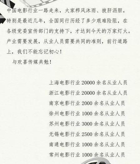 随后,上海、南京、徐州、苏州、无锡等多地电影行业从业人员也联合发布《关于电影〈囧妈〉网络首播的联合声明》,谴责《囧妈》网络首播是“破坏行业基本规则”的行为,而欢喜传媒则是“置他人利益而不顾”。