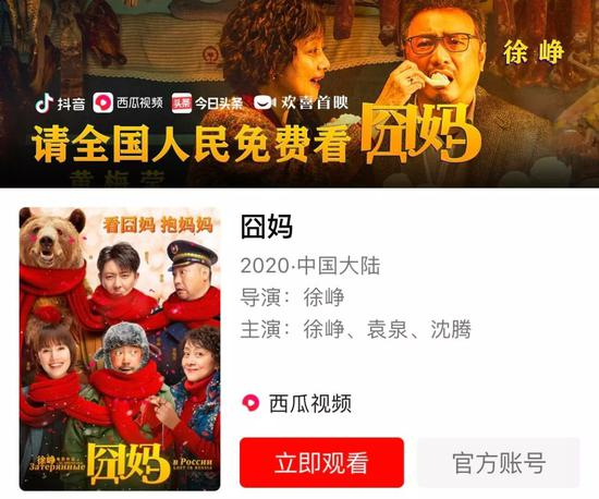 1月24日上午消息,今日头条官方宣布,《囧妈》将于大年初一登录抖音、今日头条、西瓜视频、抖音火山版等在线平台,并免费播放。