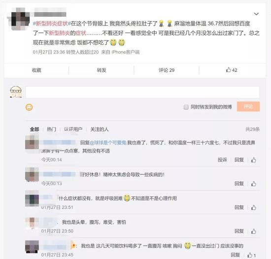 “昨天看了一下微博关于感染的症状,这心跳立马加速,慌的不行,腿也没力气胸闷气短