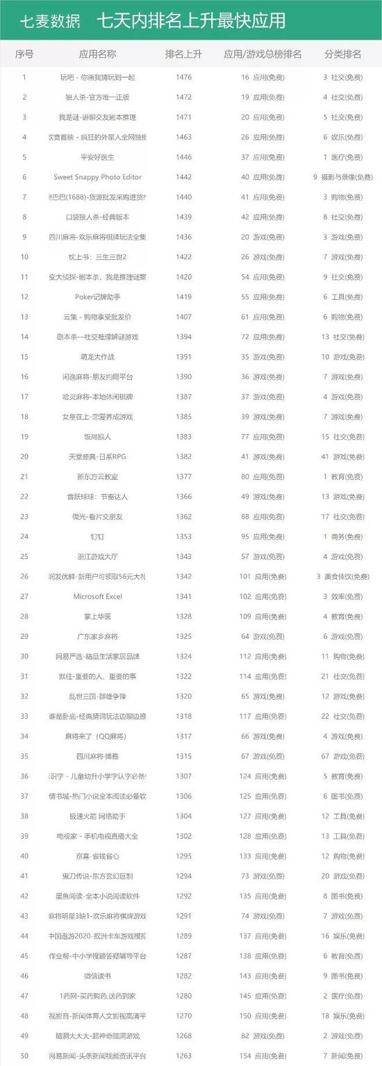 (1月21-27日排名前50的上升最快应用,数据来源:七麦数据)