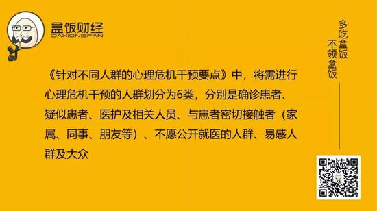 其中,在《关于印发新型冠状病毒感染的肺炎疫情紧急心理危机干预指导原则的通知》中,以附件的形式,将“针对不同人群的心理危机干预要点”进行了阐述。要点中,将人群划分为6类,分别是确诊患者、疑似患者、医护及相关人员、与患者密切接触者(家属、同事、朋友等)、不愿公开就医的人群、易感人群及大众。
