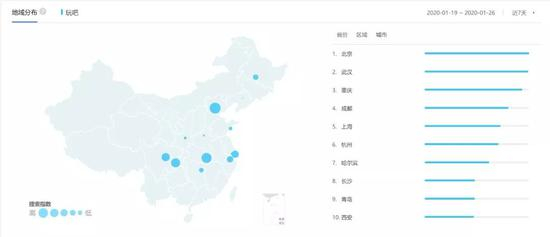 百度指数显示:近七日(1月19-26日),在百度搜索“玩吧”的人群,主要集中在北京、武汉、重庆、成都、上海、杭州、哈尔滨、长沙、青岛、西安;近一年,在百度搜索“玩吧”的人群,主要集中在北京、上海、杭州、成都、重庆、广州、武汉、深圳、苏州、郑州。
