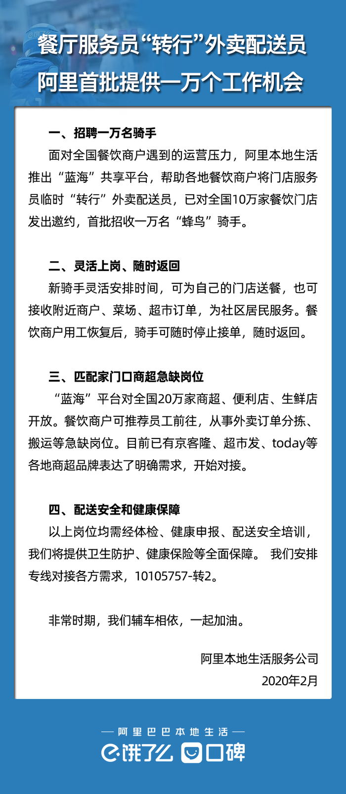原标题:餐厅服务员“临时转行”配送员:阿里首批提供一万个工作机会