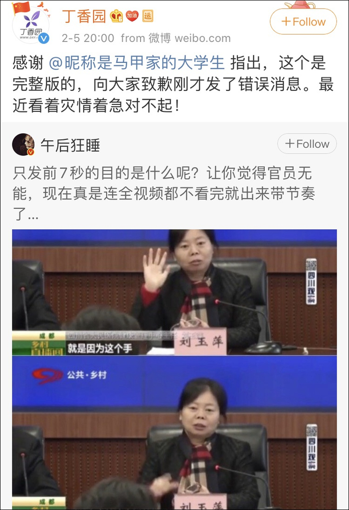 随后,视频当事人,四川省人民医院健康管理中心主任刘玉萍接受采访时指出,网上传播的并非完整片段,她当时在讲解手部卫生,通俗易懂的说法却遭到了断章取义。对此,@丁香园 于5日晚在微博辟谣并道歉。
