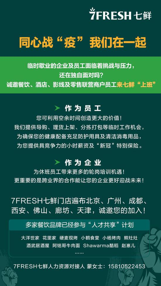京东7FRESH也已于2月5日发布了“人才共享”计划,面向全国招募临时员工,诚邀临时歇业的员工在此期间以短期打工的方式加盟,提供收银、理货、拣货打包、客服等多种岗位选择。目前,大洋世家、花里家、小鹤食堂等多家餐饮企业员工已开始到京东七鲜超市上班,同时收到多家企业热线咨询表示愿意加入。